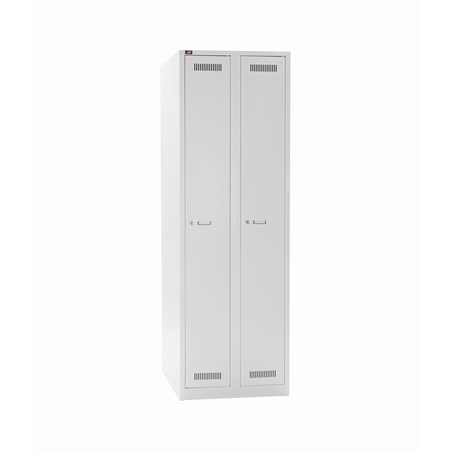 Der Garderobenschrank LIGHT von Bisley ist das Einstiegsmodell für den industriellen Bereich. Die Türen der 2 Abteile sind mit einem Zylinderschloss, Etikettenfenster und Belüftungsschlitzen ausgestattet. Pro Abteil bieten ein Hutfachboden und eine Kleiderstange mit 3 Haken Ablagemöglichkeiten für Kleidung und Sonstiges. Weitere Löcher in der Rückwand des Schrankes sorgen für eine optimale Belüftung. Die Garantie beträgt 2 Jahre. Maße: H 1850 x B 800 x T 500 mm. Farbe lichtgrau.