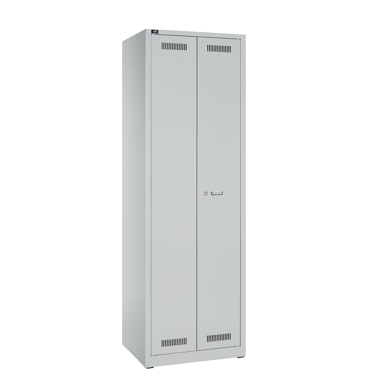 Der Allzweckschrank Bisley LIGHT verfügt über zwei zueinander schlagende Türen mit Belüftungsschlitzen im beliebten Bisley Design und ist für den Einsatz im gewerblichindustriellen Bereich ideal geeignet. Der Schrank ermöglicht sowohl die Unterbringung von Reinigungsmaterialien und Putzmitteln als auch die Aufbewahrung von Kleidung jeglicher Art. Auf der linken Seite verfügt der Allzweckschrank hierzu über vier Fachböden wohingegen auf der rechten Seite oben eine Kleiderstange mit 3 beweglichen Kunststoffhaken angebracht ist. Der untere Schrankbereich ist über die gesamte Breite offen (verkürzte Trennwand) und bietet somit Platz für größere Putzutensilien, Reinigungshelfer oder Ähnliches. Die Garantie beträgt 2 Jahre. Maße: H 1850 x B 800 x T 500 mm. Farbe lichtgrau.